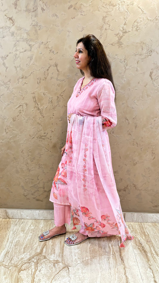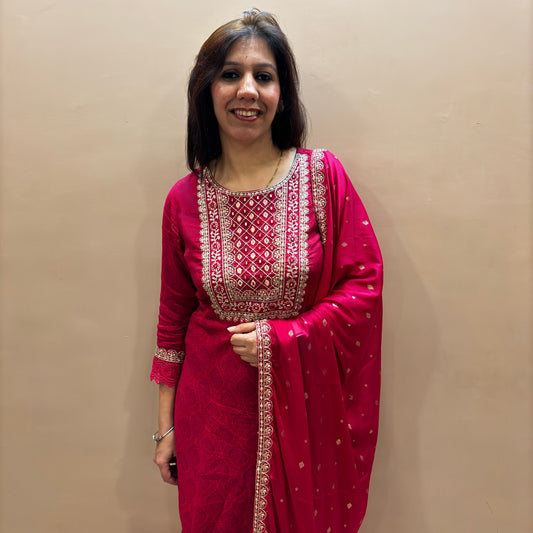 Red Raw Silk Mirror Embroidery Crop Top And Printed Palazzo With Jacket