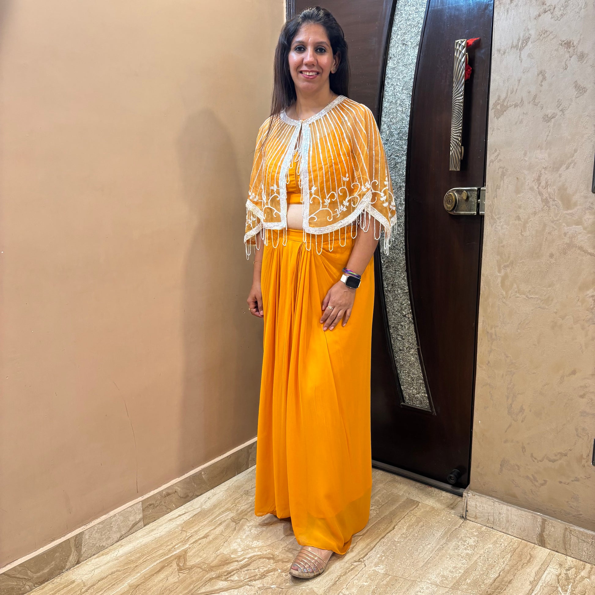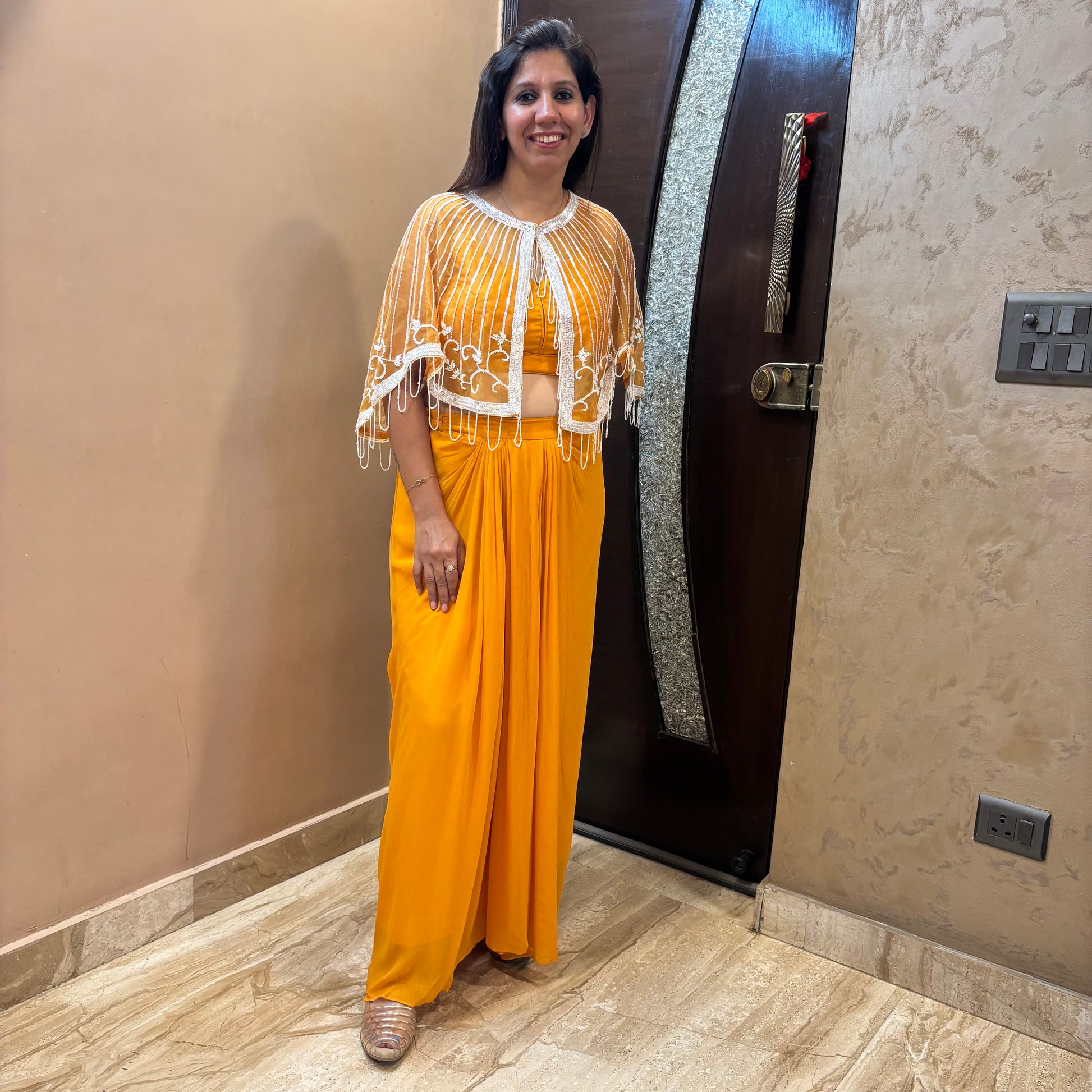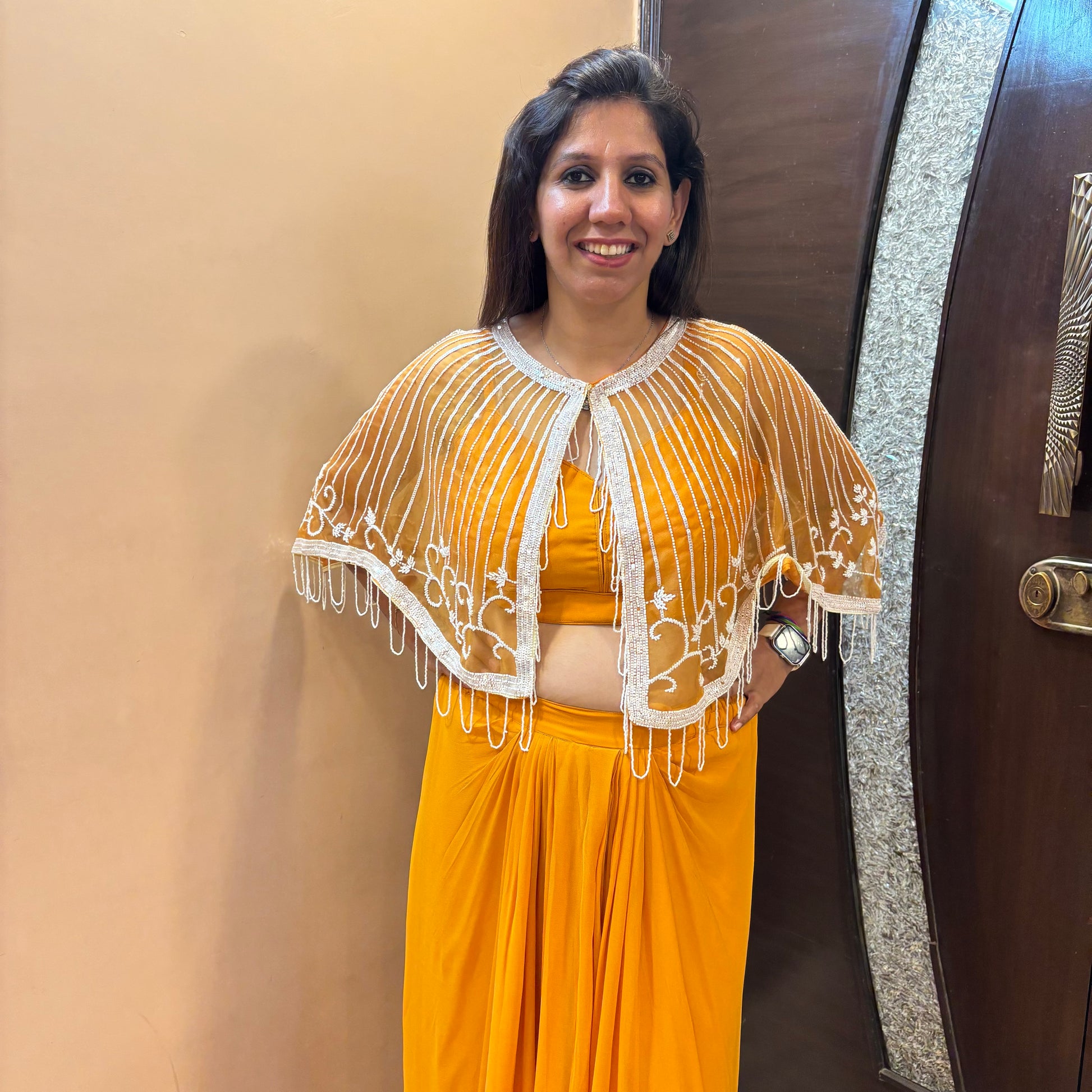 Radiate elegance with our Amber Glow Cape Set, featuring a vibrant mustard yellow drape-style skirt and matching blouse, paired with a delicate sheer cape embellished with intricate white embroidery and fringe detailing. The flowing silhouette and bold hue make this ensemble perfect for festive occasions, haldi functions, or cocktail nights, blending comfort with sophistication effortlessly.